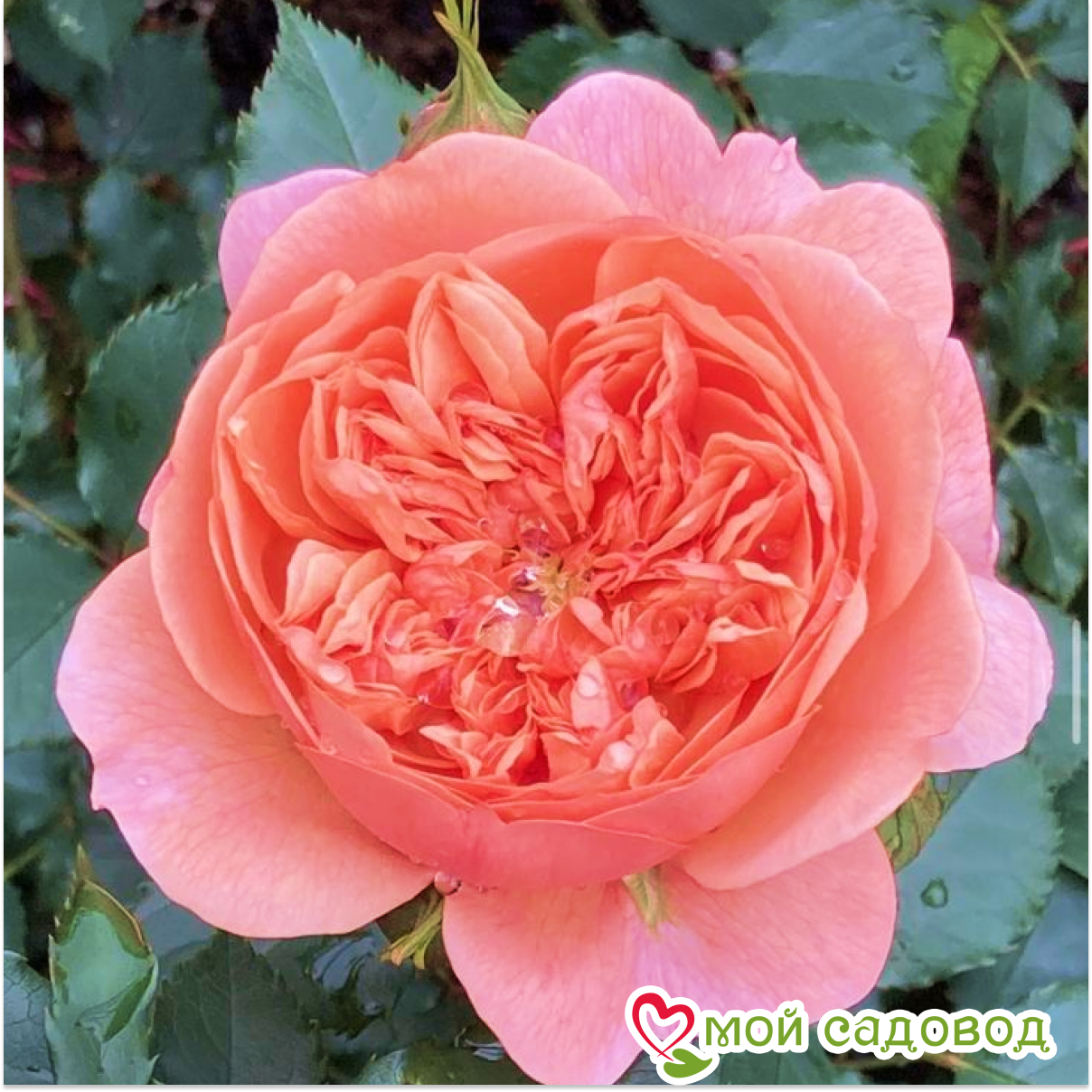 Бутон темно-оранжевый, заостренный. Цветок от ярко-золотисто-персикового до темно-абрикосового с более светлыми внешними лепестками, чашевидный до квадратного, густомахровый (60-80  лепестков), диаметр 8-10 см, обладает очень насыщенным ароматом с нотками персика и манго, медленно раскрывается, долго сохраняет форму. Цветение очень обильное, продолжительное до заморозков, повторное. Растение крепкое, сильнорослое с высокими прямостоячими побегами. Лист темно-зеленый, средний, глянцевый, кожистый, удлиненный. Устойчивость к заболеваниям: высокая. Как хранить растения, если вы получили посылку раньше начала посадочного сезона: Если роза спит — храним в холодильнике или подвале при температуре от 0 до +4 °С, или на улице в коробке под толстым слоем снега. Если роза проснулась — прикопать в теплице или высадить в сад, обеспечив укрытие. Можно посадить розу в горшок и хранить в прохладном подвале или на балконе/лоджии, притеняя от прямых солнечных лучей. Во время хранения периодически проверяйте состояние посадочного материала. Поврежденные, загнившие части корней удалите и обработайте фунгицидом (Топаз, Фитоспорин).